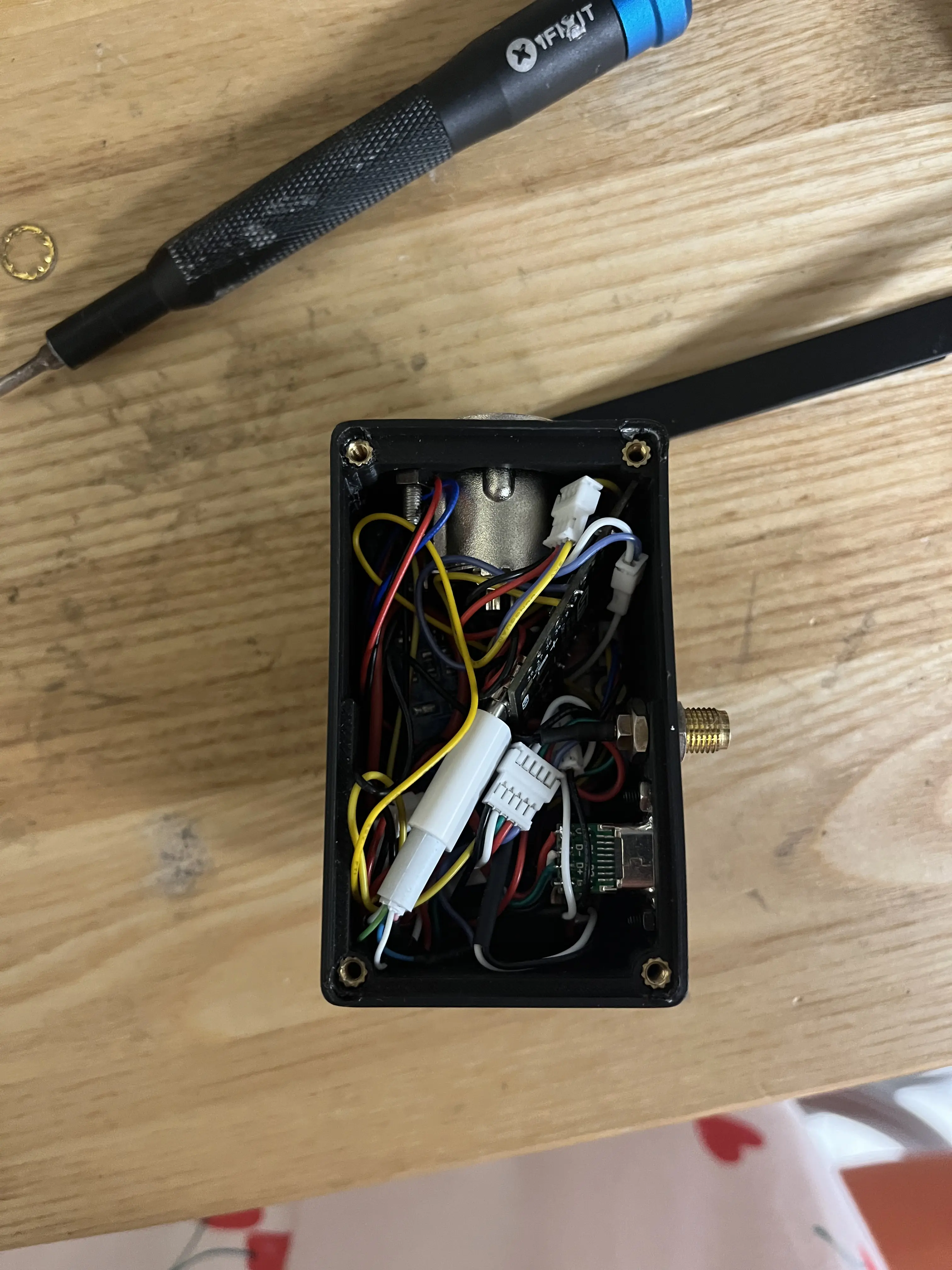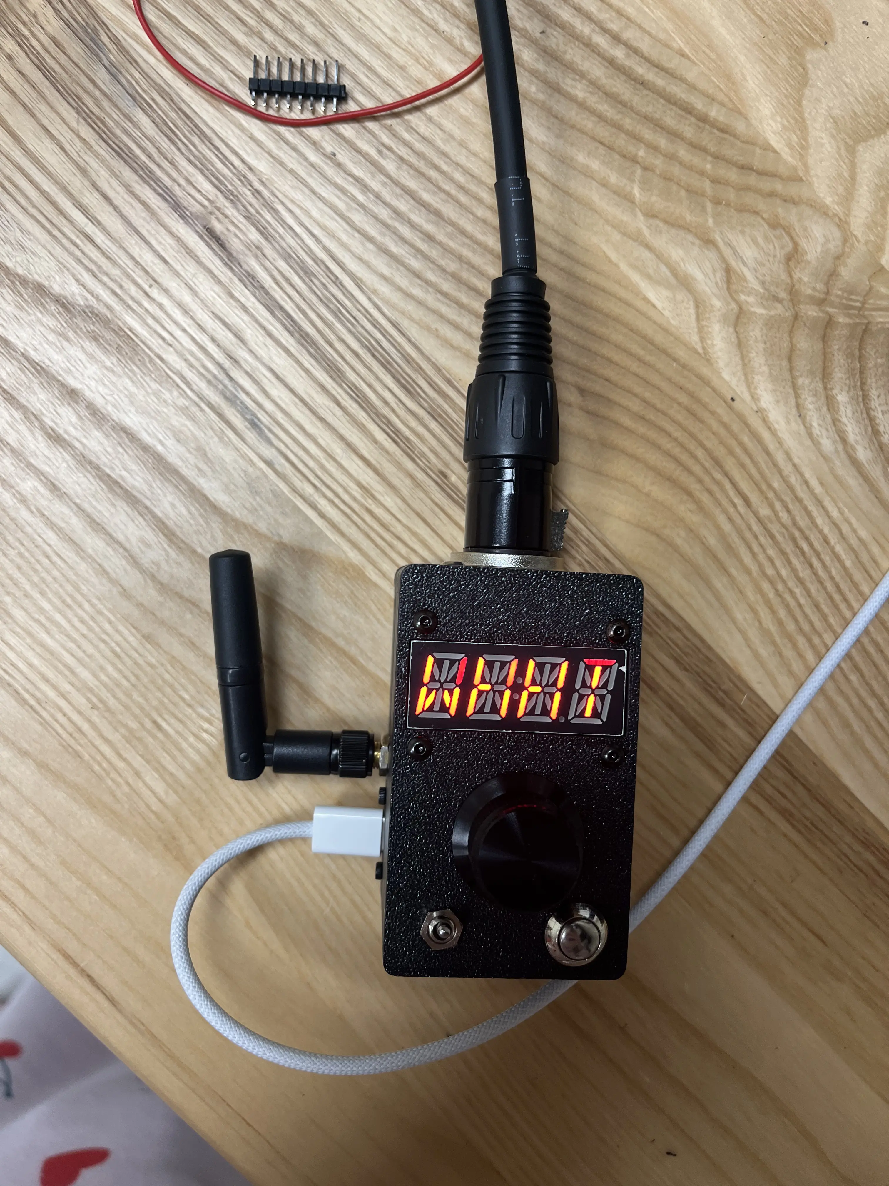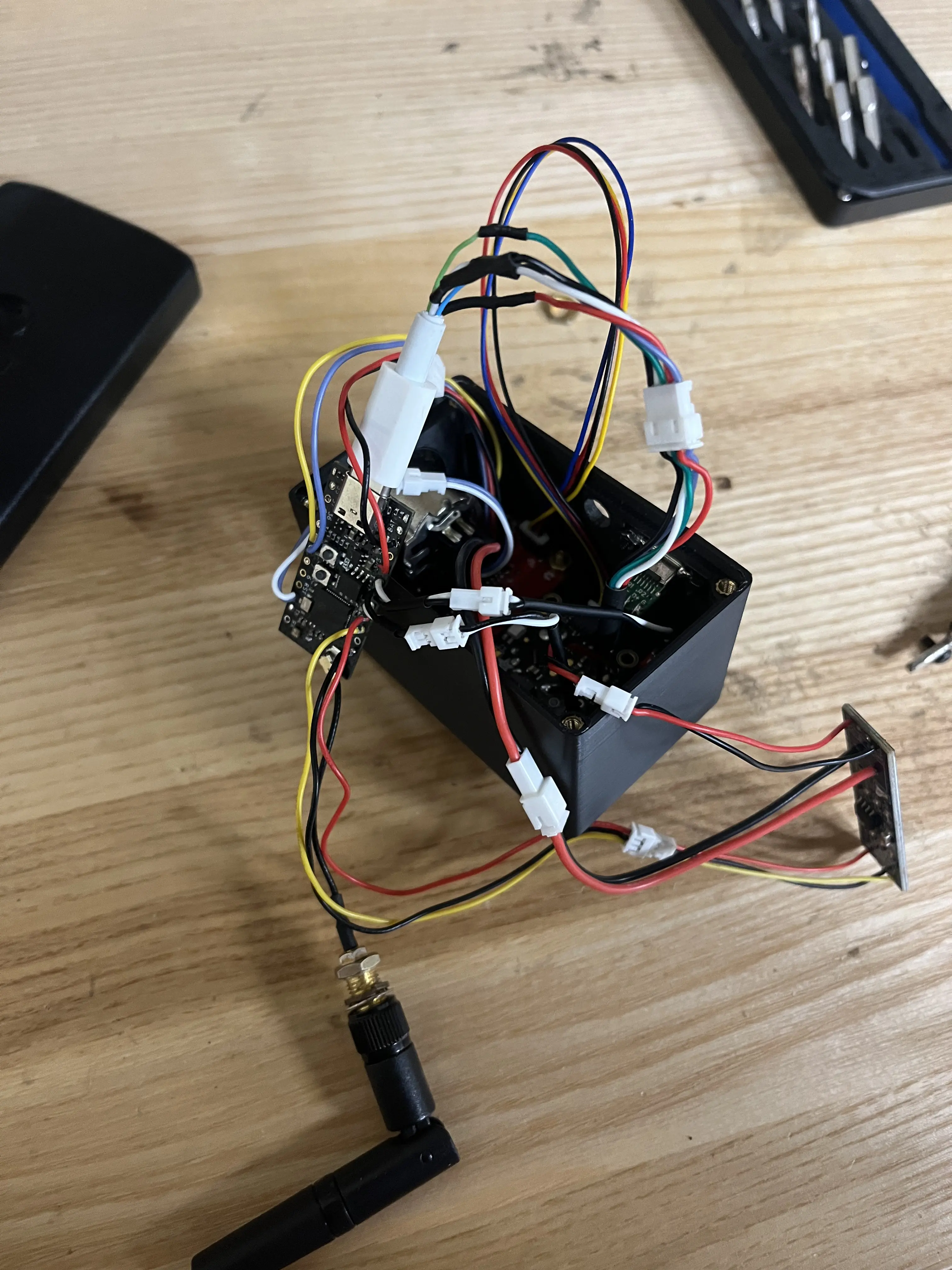 The lights are controlled over DMX, the industry standard communication protocol for stage devices. To communicate from the stage manager’s light board to the bands, I constructed a small transmitter built around a serial adapter (for the DMX signals) and an ESP32S3 (for processing and broadcasting to the bands). The transmitter had some physical controls and a display for selecting things like addresses and blacking out the bands.