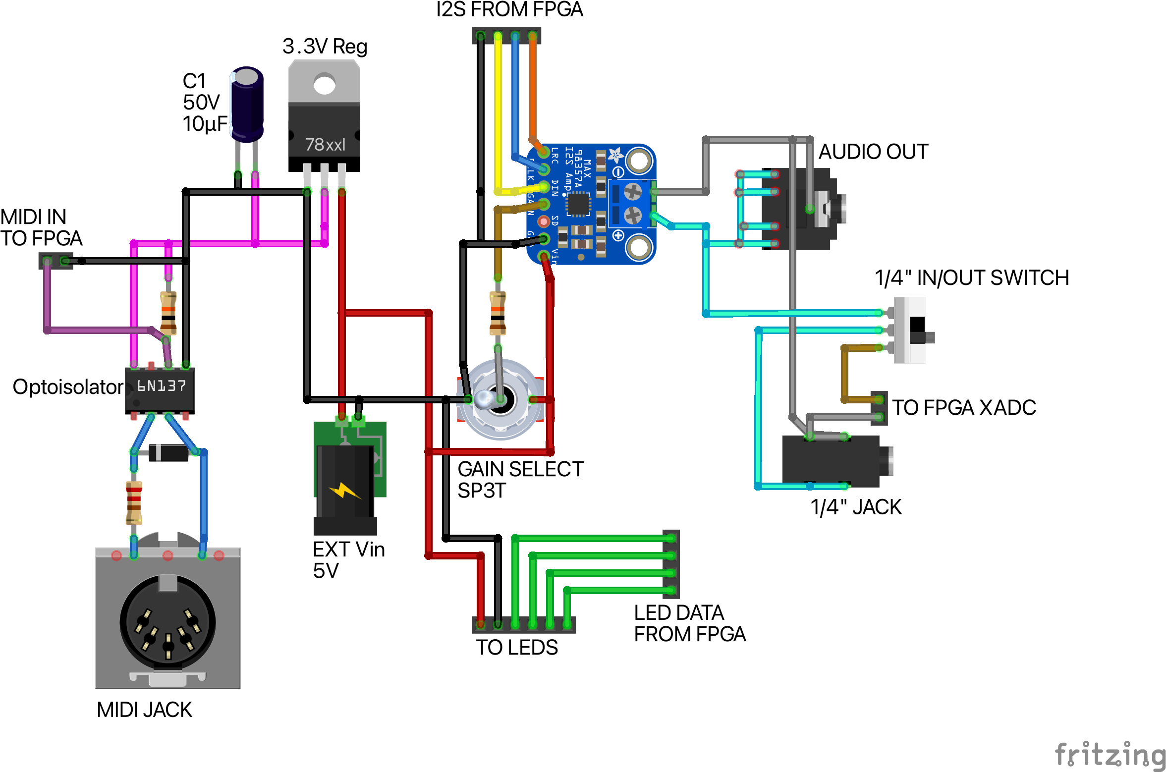 A class final: A polyphonic synthesizer that interfaces with MIDI instruments, all running on a custom soft-core FPGA. This one has it all: i2s! MIDI! WS2812 signaling protocol! Verilog!