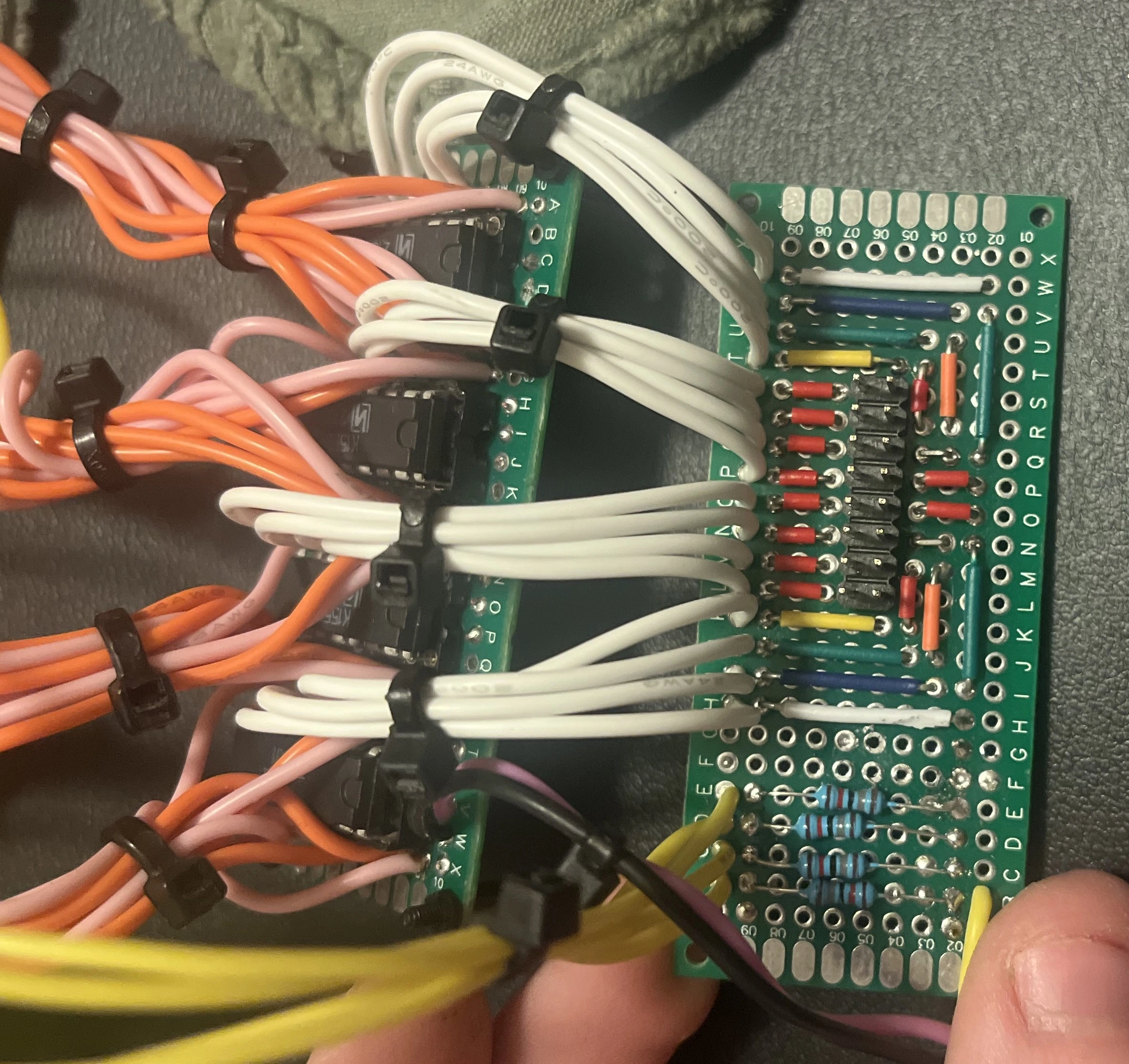 To solve the problem of where the ribbon cable connects now that there’s no counting system, I made a quick little adapter that hooks up the 16 inputs to the outputs of two shift registers, and wired those shift registers to a microcontroller.