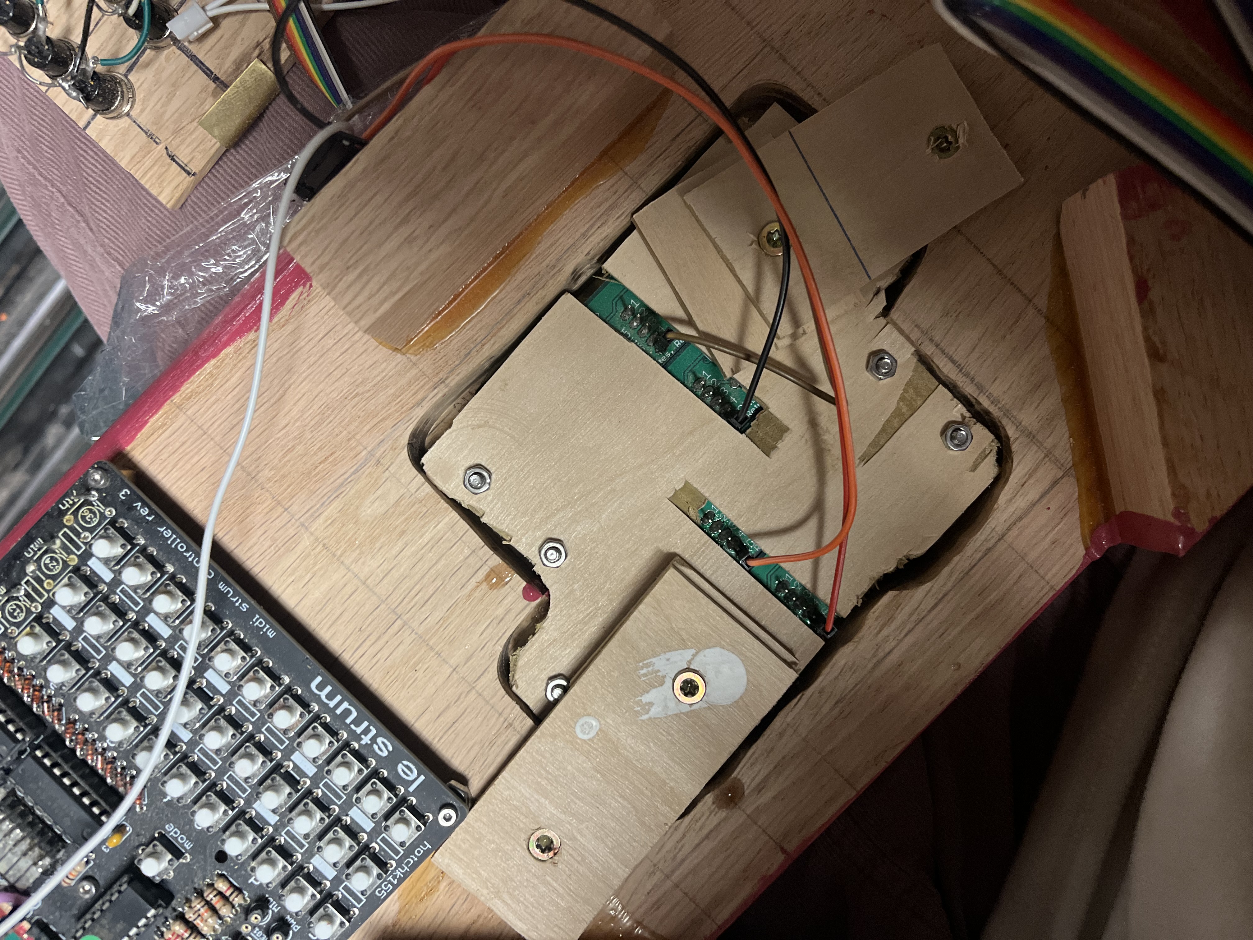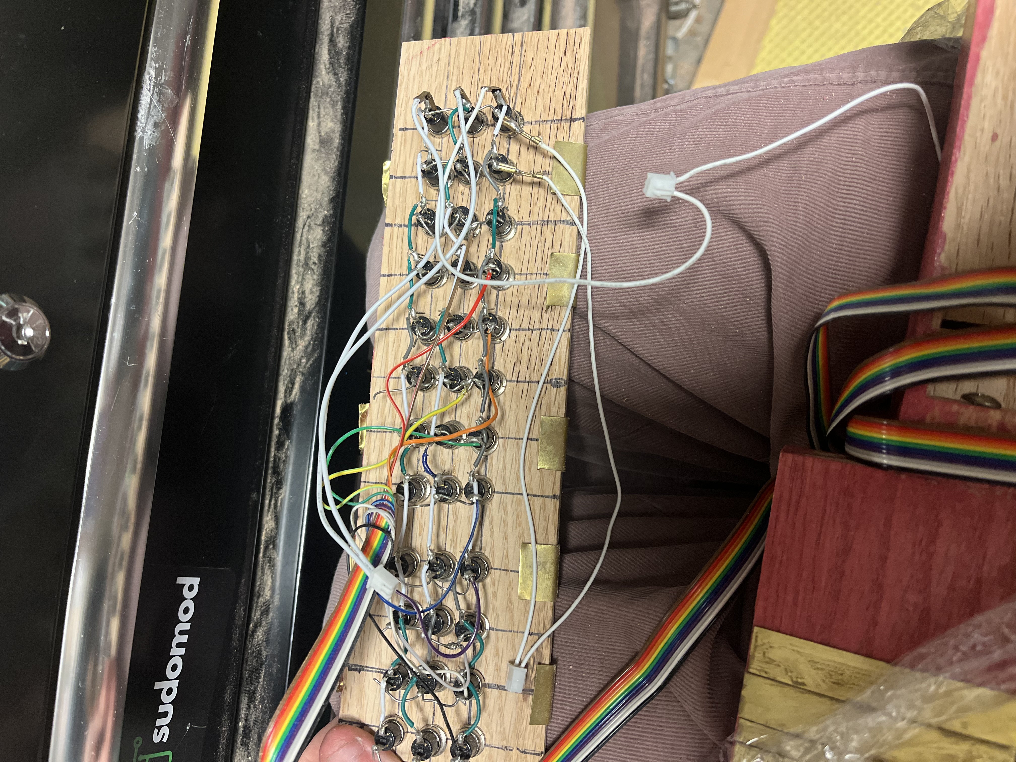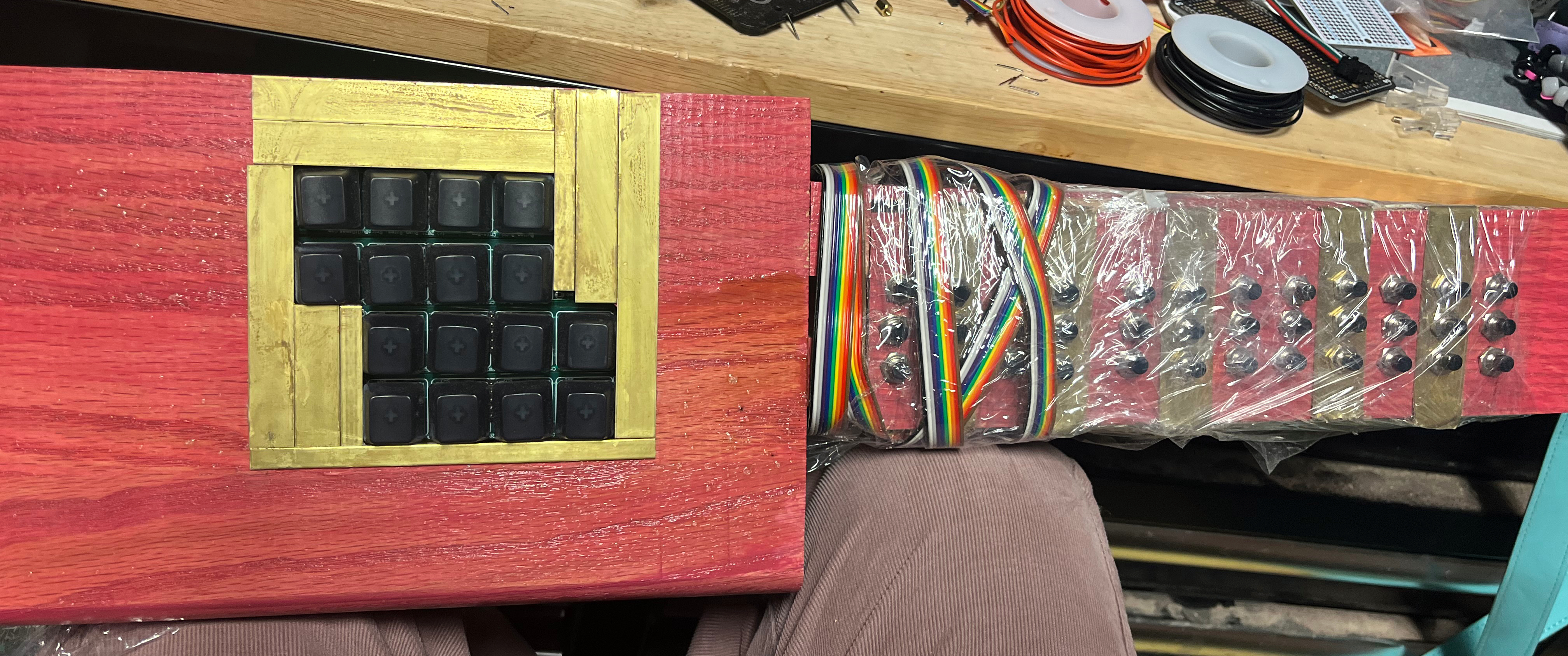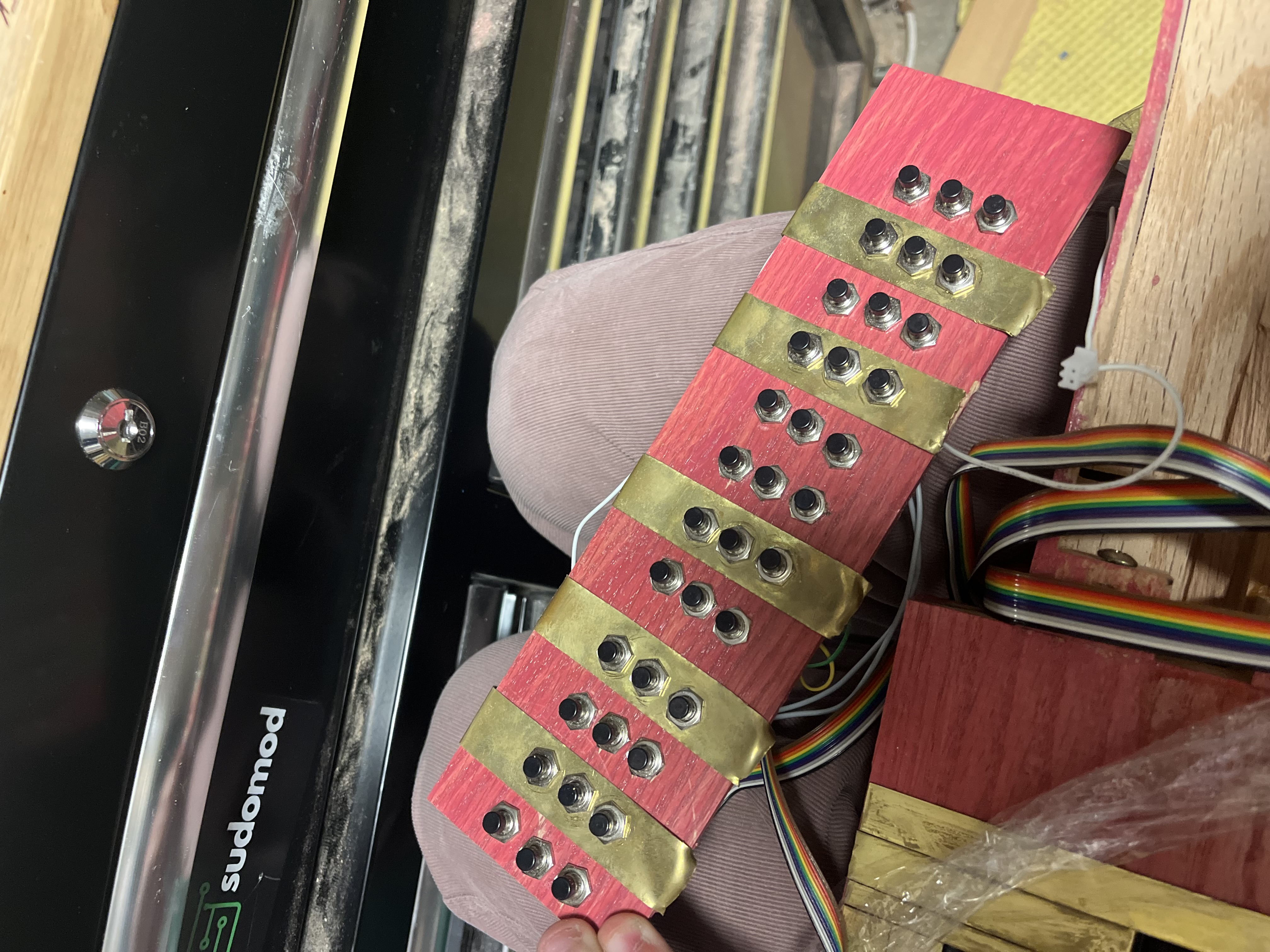 This is a MIDI controller I made in high school to model an omnichord, which is a type of chorded keyboard/guitar combination where you can select a chord and then “strum” notes in that chord. I used mechanical keyboard switches (Cherry MX Blues) for the “strumming” and a matrix of small pushbuttons on the ‘neck’ foor selecting chords. The body is made of a pine stair that was stained pink, along with an “oak fretboard” and copper accents. The controller electronics are based around a tiny MIDI controller called “Le Strum” and functions basically as a replacement of the I/O on that board. Here are photos of the ‘finished’ product, which got wrapped up and stored in the garage because I just bought a real omnichord on ebay shortly after finishing it. What an anticlimactic ending.